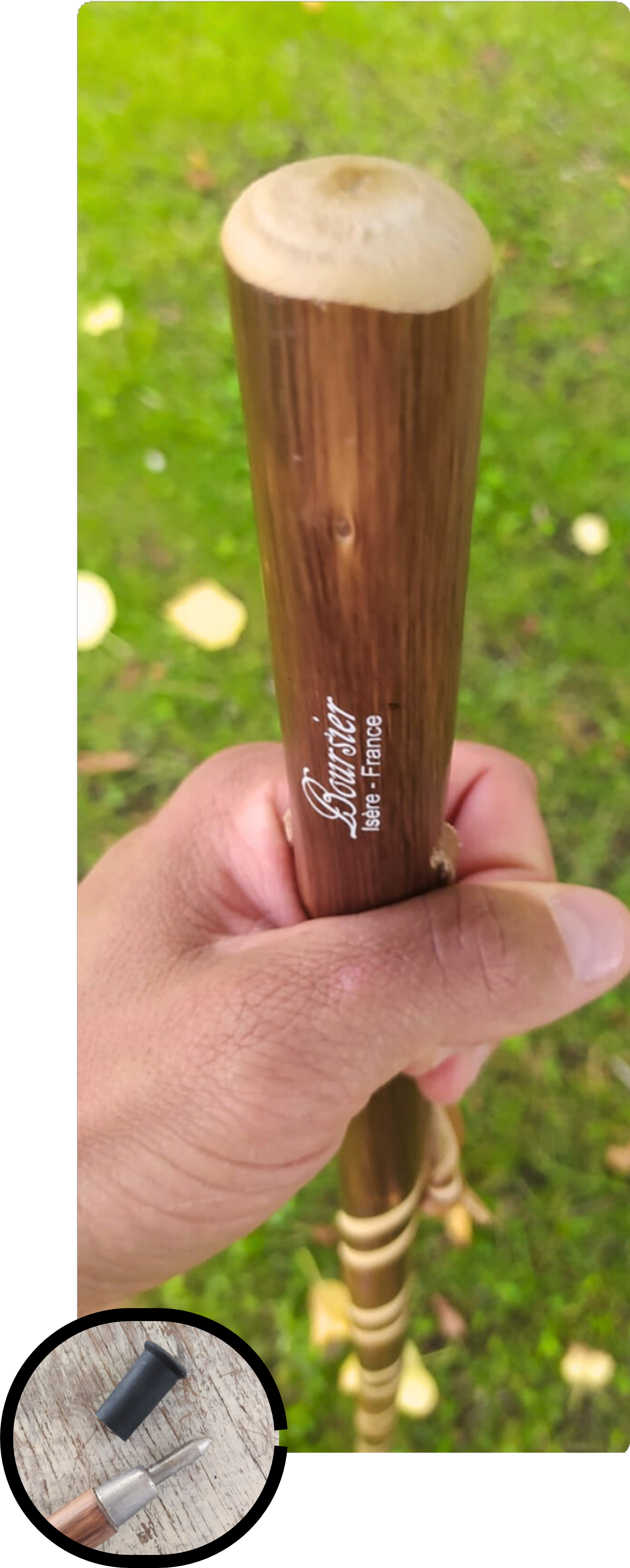 Équipé d’une dragonne solide, d’une virole de renfort et d’une pointe métallique dévissable avec embout en caoutchouc, il s’adapte aussi bien aux sentiers qu’aux sols durs.