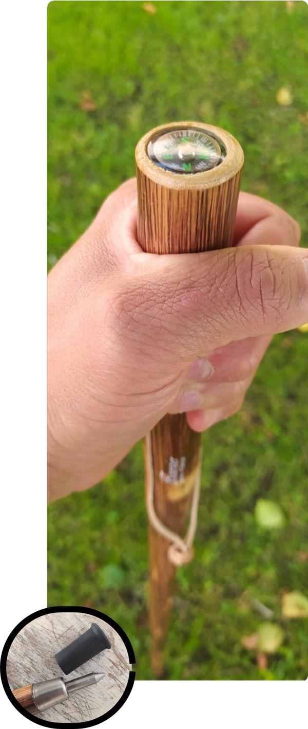 Équipé d’une dragonne solide, d’une virole de renfort et d’une pointe métallique dévissable avec embout en caoutchouc, il s’adapte aussi bien aux sentiers qu’aux sols durs.