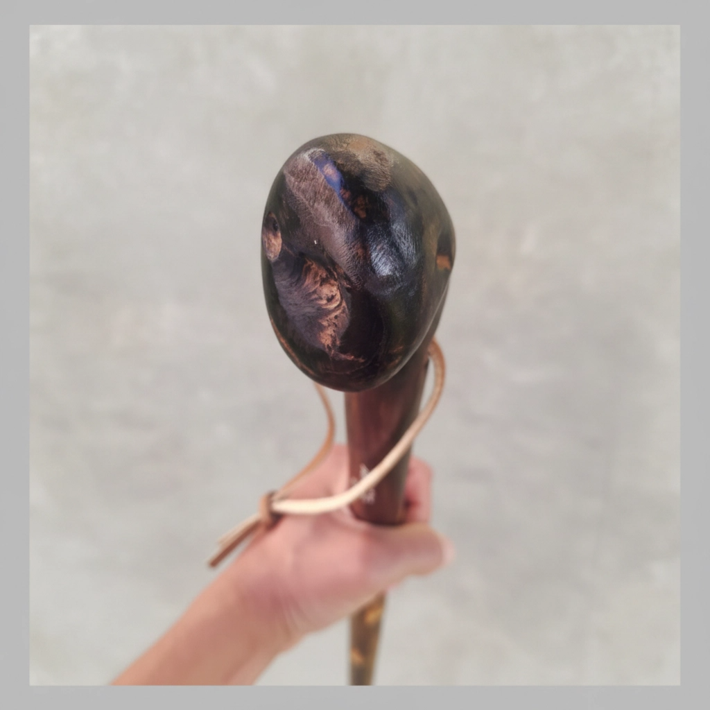 Ce bâton singulier est façonné à partir d’une racine naturelle, lui conférant une silhouette unique et une solidité exceptionnelle. Son bois chalumé puis verni révèle un aspect chaleureux et authentique, sublimé par la forme irrégulière de la racine.