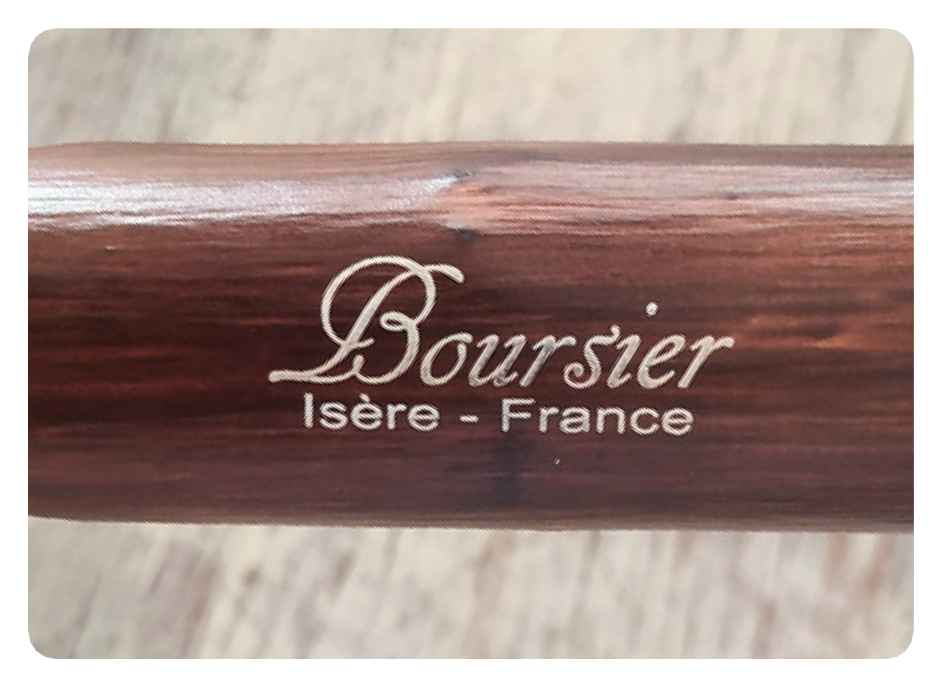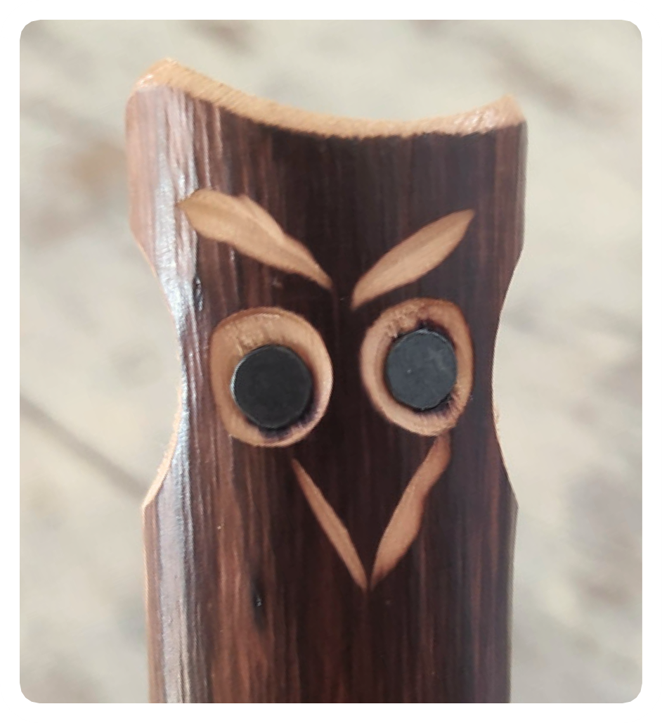 Ce bâton est orné d’une chouette gravée à la main, dont les yeux sont soulignés par deux clous de tapissier. Symbole de la Chartreuse, la chouette évoque la sagesse, la discrétion et l’ancrage dans la nature, autant de valeurs portées par ce bâton au caractère unique.
